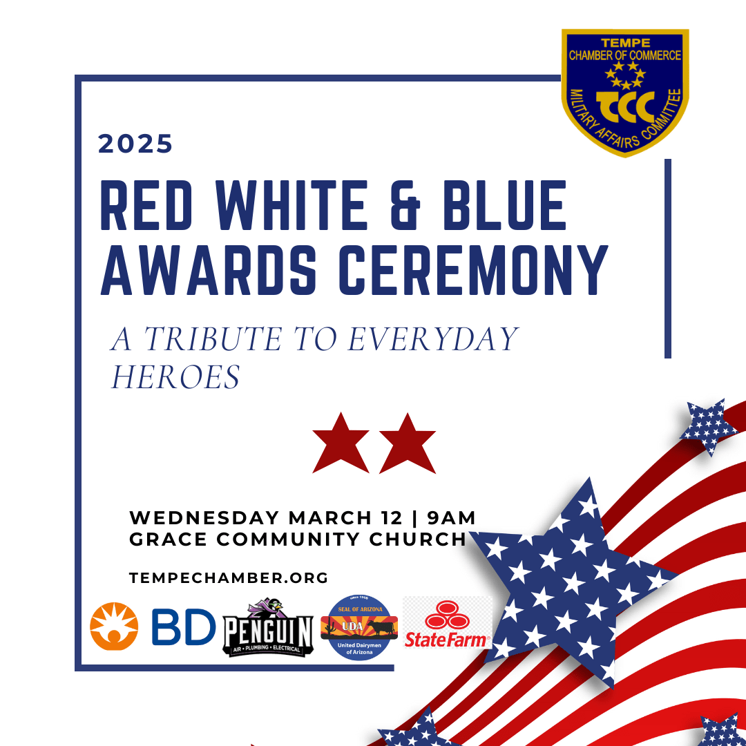 Join the Tempe Chamber Military Affairs Committee for the 7th Annual Military Affairs Committee Red, White, and Blue Awards ceremony, "A Tribute to Everyday Heroes," on Wednesday, March 12, from 9:00 to 10:30 a.m. at Grace Community Church.