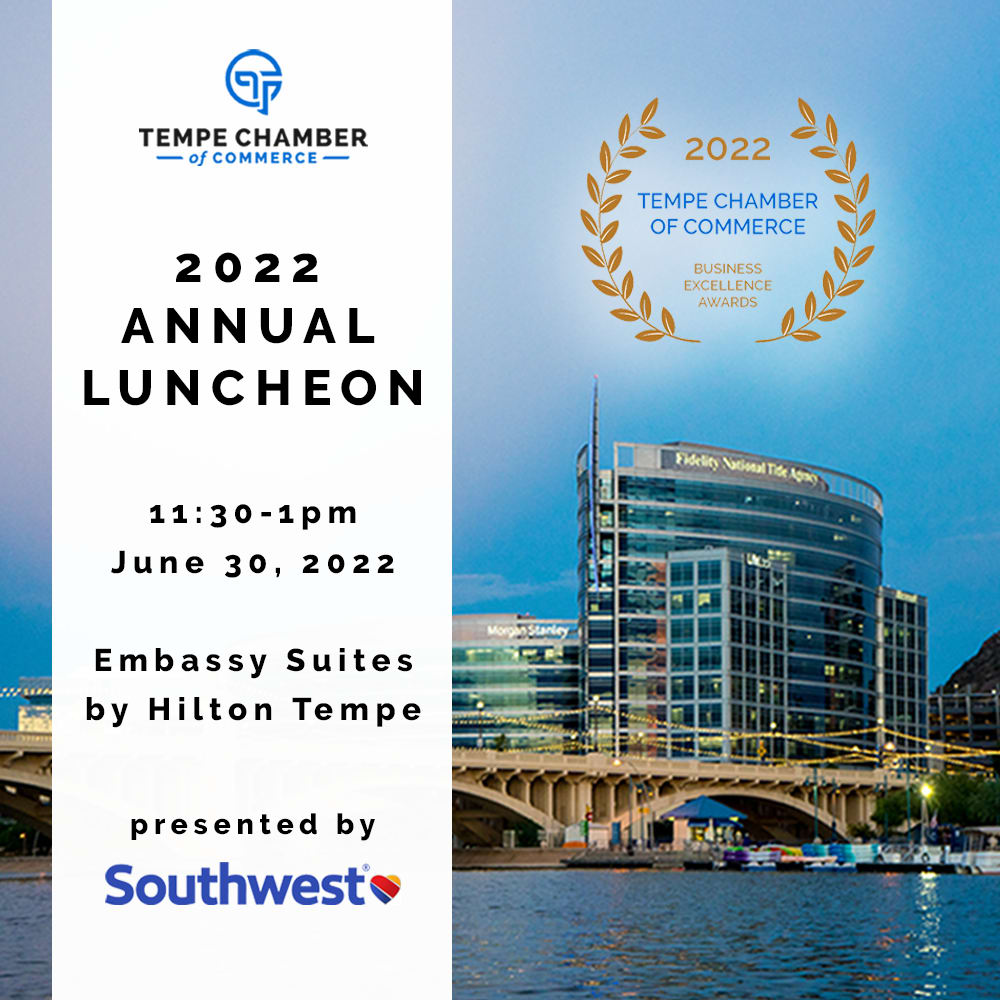 Reflecting on the past year while looking forward to the future, we celebrate and share our vision for the Tempe Chamber and the business community at the Annual Luncheon. There will be an introduction of the incoming Chair of the Board, Board of Directors and Committee Chairs while honoring those who are moving on from their terms of service. Presentations by our leadership and an awards ceremony for our members add to the enjoyment of this plated luncheon.
