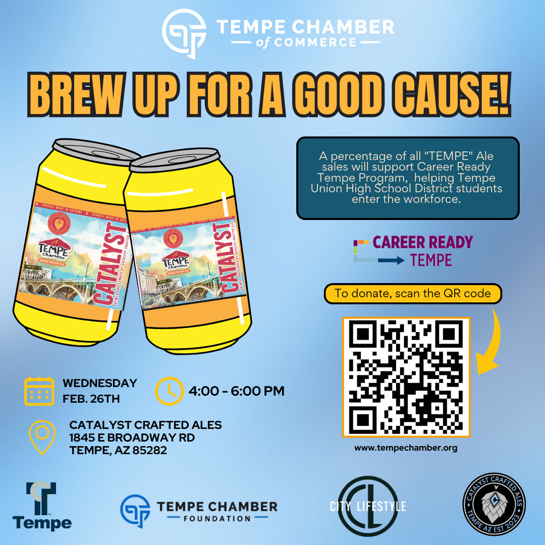 Catalyst Crafted Ales and Tempe City Lifestyle are excited to co-host the February Tempe Chamber Business After Hours! We’ll be launching the newly crafted Tempe Chamber of Commerce "TEMPE" Light Ale. A percentage of every "TEMPE" ale sale will go directly to the Career Ready Tempe program, helping Tempe Union High School District students enter the workforce and build their better future.