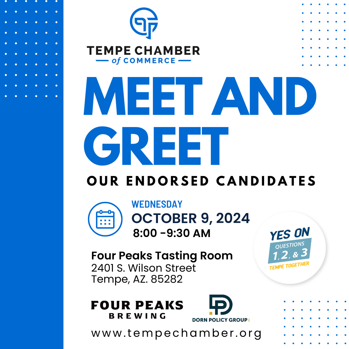 Join the Tempe Chamber of Commerce leadership for a meet and greet with our endorsed candidates on Wednesday, October 9. The event will be held at the Four Peaks Wilson in Tempe. This is an informal meet and greet session where attendees can visit with candidates to ask questions that matter to them.