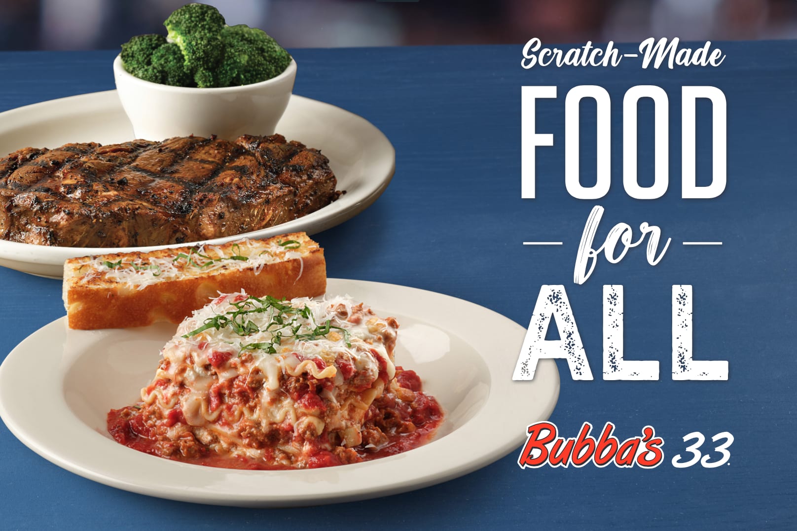 Bubba's 33 was born in 2013 and was created by Kent Taylor, the founder of Texas Roadhouse. Our focus has always been on delicious, made-from-scratch food for all, friendly service, and a fun atmosphere. Enjoy signature 1/2 lb burgers, homemade pizza, ice-cold beer and handcrafted cocktails in a fun, upbeat atmosphere with garage doors, music videos and wall to wall TVs.