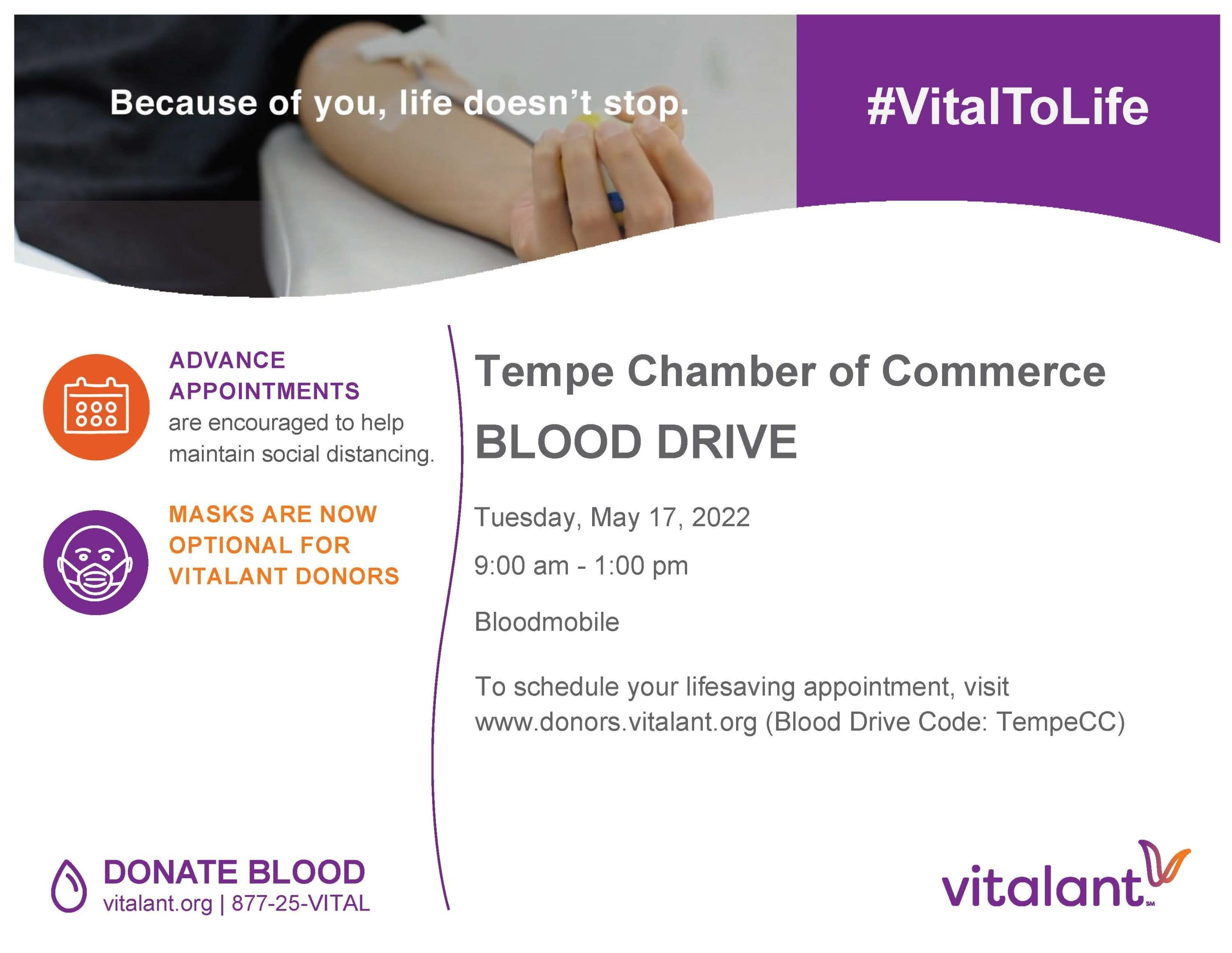 On May 17th, the Tempe Chamber of Commerce will be hosting a blood drive with Vitalant. There’s an URGENT NEED for blood right now and patients need your help. CLICK HERE to schedule your life saving blood donation.