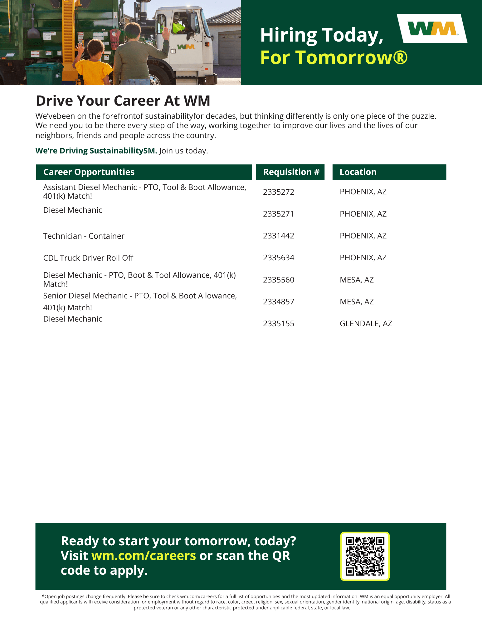 WM is filling positions for Diesel Mechanics, Assistant Diesel Mechanics, CDL Drivers & Technicians (Welding) in the Meza, AZ area. Please see attached flyer for details on the roles.